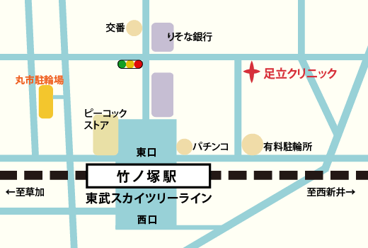 足立クリニックは、竹ノ塚駅 東口より徒歩5分のところにあります。